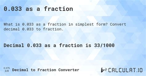 0.033 As A Fraction. Decimal to fraction chart and calculator. Web for calculation, here's how to convert 0.033 as a fraction using the formula above, step by step instructions are given below take only after the decimal point part for calculation.