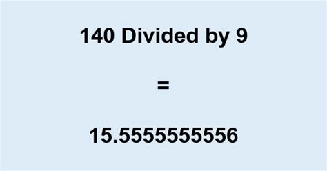 140 Divided By 9. Quotient (decimal) quotient (integer) remainder multiplication calculator see also multiplication calculator remainder calculator addition calculator The math calculator will evaluate your problem down to a final solution.