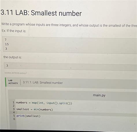 3.11 Lab Smallest Number. Read 3 input numbers using input() or raw_input(). The language is python 3.
