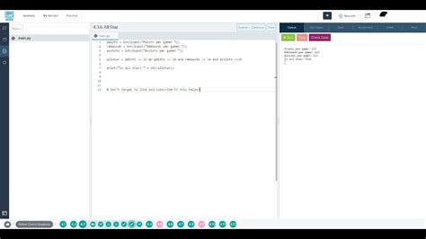This is what i have so far, i'm not really sure what i'm doing wrong. All star points = int (input (how many points per game do you score? Web codehs/3.3.6 hello name.txt. I need help solving 4.3.6 all star. Their points per game, their rebounds per game, and their assists per game, in that order. Ap practice 4.3.7 ap practice: Web 4.3.6 all star # enter your code here points = int (input (how many points do you get per game?: )) rebounds = int (input (how many rebounds per game do you get? Latest commit 4baa85b on may 27, 2021 history. )) print (points) rebounds = int (input (how many rebounds do you get per.