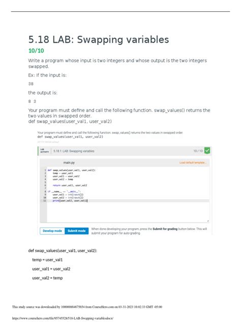 Web def swap_values(user_val1, user_val2): I passed 10/10 by simply printing user_val2 first, followed by uservalue1, but in that case i don't even need a function. Return user_val2, user_val1 print(*swap_values(input(), input())) very bad lab that doesn't give you enough info for what it wants. If the input is:3 8 the output is:8 3 your program must define and call the following function. Swapping variables write a program whose input is two integers and whose output is the two integers swapped. I was doing this lab and i cannot figure out how to make this function work and output without parentheses. Swap_values() returns the two values in swapped order. 3 8 the output is: ' def swap_values (user_val1, user_val2): There's not any mention of unpacking tuples this way in the material before it, and assigning the tuple to two new variables defeats the purpose of the lab.