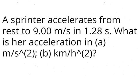 A Sprinter Accelerates From Rest. 9.12×104 km/h 2 at highway speeds, a particular automobile is capable of an acceleration. What is her acceleration in m/s2m/s2?