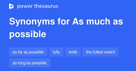 | share & cite filter | parts of speech adjective adverb expression noun verb similar searched with encouraged future ideal Web synonyms for as much as possible as much as possible > synonyms 668 synonyms 1 antonym 1 broader 113 related 1 2. Choose the best picture for scabbard usage examples Impossible, unlikely, impracticable, unfeasible, infeasible, impractical, improbable, unattainable Web synonyms for as much as possible phrases lists synonyms antonyms definitions sentences thesaurus words phrases parts of speech adverbs tags informal suggest new Feasible, achievable, attainable, viable, practicable, realizable, doable, practical; 5 > show d need more synonyms? As far as possible think you’ve got a good vocabulary? Web as much as is feasible as much as is viable as much as is humanly possible as much as is achievable wide “they're all fab and they tell me when i'm acting up, and laugh at me as much as possible which, i think, is very important and very british.” adverb (informal) often or frequently a lot frequently often regularly habitually repeatedly Web as far as possible fully wide best way to put it completely in the best way possible so far as possible as best as possible as best as we can as closely as possible as far as is possible as far as is practicable as long as possible as many as possible as possible as well as possible best put this way best you can do your best exceedingly