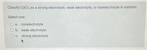 Decreased extracellular potassium produces paralysis; Web to tell if cacl2 (calcium chloride) is an electrolyte or nonelectrolyte we first need to know what type of compound we have. Solutes formula hydrochloric acid hcl sodium hydroxide naoh hydrofluoric acid hf methyl amine ch3nh2 aluminum chloride alcl3 methanol ch3oh glucose c6h12o6 drag the appropriate items to their respective bins. Web answer) 1) cacl2 = strong electrolyte ( when cacl2 dissolves in water it br… view the full answer transcribed image text : Excessive extracellular sodium causes fluid retention; Web weak electrolytes are only partially ionized, and the fraction ionized varies inversely with the concentration of the electrolyte. Web classify each of these soluble solutes as a strong electrolyte, a weak electrolyte, or a nonelectrolyte. Non electrolyte x hcl(g) (strong, weak, or non electrolyte) answer: By definition, all salts are strong electrolytes (exceptions are very rare). It all boils down to the definition of a strong and a weak electrolyte.