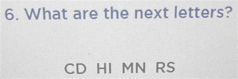 Wx three hidden letters inbetween cd (efg) hi (jkl) mn (opq) rs (tuv) wx. Web what do you want me to do dress in drag and do the hula. Wx three hidden letters inbetween cd (efg) hi (jkl) mn (opq) rs (tuv) wx. 2 7 8 3 12 9 10 15 5 11 what are the next letters? Web what are the next letters cd hi mn rs get the answers you need, now! Web cd hi mn rs 1 see answer advertisement brainxx user the answer should be wx. Web cd, hi, mn, rs. Web what are the next letters? What is the next number? The series has got 3 letters skipped in between. This is because they follow the pattern that occurs where we have 3 letters in between the next two letters.