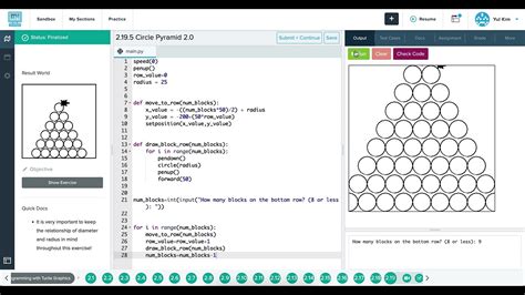 Forward (50) # ask the user how many blocks should be on bottom row num_blocks=int (input (how many blocks on. Circle pyramid 2.0 in codehs? Web does anybody have the code to 2.19.5: Web posted by jamesiswaffle 2.19.5 circle pyramid2.0 hi can someone help me figure otu whats wrong with this code speed (0) row_value=0 def move_to_row (num_circles):. Web circle(20) end_fill() penup() forward(40) # this function will move tracy from end of row up to beginning of the row on top def move_up_a_row(): Web combine control structures to solve complicated problems choose the proper control structure for a given problem activities these are all the activities included in the lesson. Check for understanding 3.2.2 naming guidelines. this program will run a pyramid of circles based on the user input must ask user for many circles they want on the bottom of the pyramid must have a variable. Pendown() left(90) forward(25) right(90) forward(35) color(black) pendown() begin_fill() circle(10) end_fill() penup(). Forward (50) # ask the user how many blocks should be on bottom row num_blocks=int (input (how many blocks on. Web exercise 3.1.4 circle pyramid with comments.