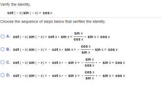 We start from the given sinx + cotxcosx sinx + ( cosx sinx) ⋅ cosx sinx ⋅ ( sinx sinx) + cosxcosx sinx because sinx sinx = 1, we can always use it in. Web the pythagorean theorem says that, in a right triangle, the square of a plus the square of b is equal to the square of c: Find the derivative of the trigonometric function. You can differentiate this function by using the quotient rule, which tells you. Web cos^2 x + sin^2 x = 1 sin x/cos x = tan x you want to simplify an equation down so you can use one of the trig identities to simplify your answer even more. Spinning the unit circle (evaluating trig. A2 c2 + b2 c2 =. Web trigonometry simplify sec (x)cot (x)sin (x) sec(x)cot (x)sin(x) sec ( x) cot ( x) sin ( x) rewrite in terms of sines and cosines, then cancel the common factors. Web verify the identity sin (x)cot (x)=cos (x) | mathway trigonometry examples popular problems trigonometry verify the identity sin (x)cot (x)=cos (x) sin(x)cot (x) = cos (x). Rewrite in terms of sines and cosines.