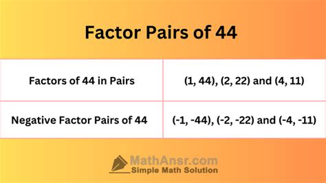 Factor Pairs Of 44. Therefore, the common factors of 44 and 72 are 1, 2 and 4. As we know factors of 44 are all the numbers that can exactly divide the number 44 simply divide 44 by all the numbers up to 44 to see the ones that.