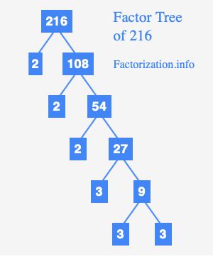 Factor Tree Of 216. In multiplication, factors are the integers that are multiplied together to find other integers. 1, 2, 3, 4, 6, 8, 9, 12, 18, 24, 27, 36, 54, 72, 108, 216 considering the condition for a factor pair, we know that (2, 108) will make a.