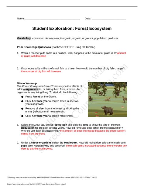 Investigate the feeding relationships (food web) in the forest. Web forest_ecosystem_gizmo ( all answers correct ) document content and description below student exploration: Report copyright violation also available in package deal (1) gizmos student exploration bundle| latest complete solutions for grade a $ 978.71 $ 450.49 79 items 1. Forest ecosystem answer key preview 2 out of 7 pages getting your document ready. Consumer, decomposer, inorganic, organic, organism, population, producer prior knowledge questions (do these before using the gizmo.) 1. Investigate the feeding relationships (food web) in the forest. Most plants use photosynthesis to create organic material from carbon dioxide in the air. Click the card to flip 👆 flashcards learn test match created by jq104 terms in this set (7) consumer an organism that feeds on organic matter because it cannot produce it. No sunlight reaches the ocean floor, but some bacteria can use energy from. Web gizmos student exploration: Web forest ecosystem gizmo 2.1 (7 reviews) term 1 / 7 consumer click the card to flip 👆 definition 1 / 7 an organism that feeds on organic matter because it cannot produce it.