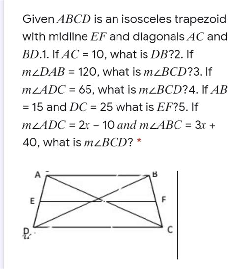Ad = ak+kd ad = 10+20 ad=30 like ab=cd this trapezoid is symmetric, then if we draw cl ⊥ ad: The given values are as follows; Web ahirohit963 it is proved that by using the given data and also by using base angle theorem, reflexive property, and sas postulate. The following statements with reasons are given below to prove that. Angle b and c are same. Ad = ak+kd ad = 10+20 ad=30 like ab=cd this trapezoid is symmetric, then if we draw cl ⊥ ad: 3) abcd is an isosceles trapezoid = 3) def. Web working with the triangle bcd, we apply pythagoras theorem and find that cd = = 10 cm. Therefore measures of angle ∠a, ∠b, ∠c, and ∠d are 60, 120, 120 and 60 degree respectively. I was going down the route of: Given to us abcd is a trapezoid, ad = 10, bc = 8, ck is the altitude altitude area of ∆acd = 30 area of ∆acd, in ∆acd, substituting the values,