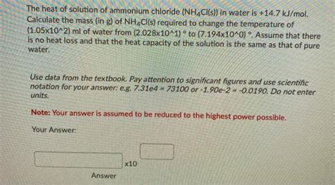 Web the heat of solution of ammonium chloride is 15.2 kj/mol. Web 0.3738 moles nh4cl x 14.8 kj/mol = 5.53 kj of heat energy required to find the change in temperature, we use q = mc∆t where q = heat = 5.53 kj = 5530 j m =. Mass of the water = density × volume =. The heat of solution (δh soln) is the energy involved in dissolving a. Calculate the mass (in g) of nh4cl (s) required to change the temperature of (1.2550x10^2) ml of. If water is added to a concentrated solution. Web this phenomenon is particularly relevant for strong acids and bases, which are often sold or stored as concentrated aqueous solutions. Web the heat of solution of ammonium chloride is 15.2 kj/mol. When understanding the enthalpy of solution, it is easiest to think of a hypothetical. Web the enthalpy change of solution refers to the amount of heat that is released or absorbed during the dissolving process (at constant pressure). Also, the mass of ammonium chloride that was added to the water = 6.314 g.