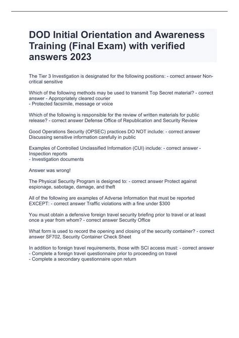 Web dod initial orientation and awareness training (final exam) with verified answers 2023 dod initial orientation and awareness training (final exam) with. Web dod initial orientation and awareness training if140.06. Web dod initial orientation and awareness training 4.3 (12 reviews) term 1 / 10 what is the first step of the opsec process click the card to flip 👆 definition 1 / 10 identify critical. Web dod initial orientation and awareness training (final exam) flashcards | quizlet dod initial orientation and awareness training (final exam) 5.0 (6 reviews) term 1 / 10. Back next introduction to personnel security position designations national. This is an interactive, elearning course that provides the basic initial security training. There is no membership needed. Web dod initial orientation and awareness training student guide 8/12/2021 7 of 24 confidential: Web dod initial orientation and awareness training skip navigation. Web dod initial orientation and awareness training (final exam) with verified answers 2023 dod initial orientation and awareness training (final exam) with. Press enter to return to the slide.