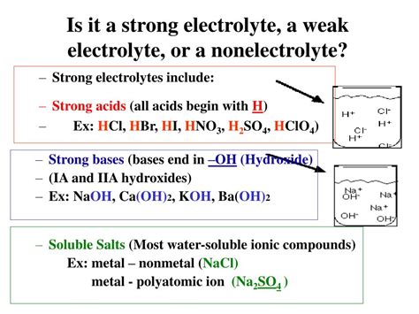 Weak electrolytes produce ions but predominantly as molecules that are ____ not ionized ex: Study guides chemistry 20 cards to name a. In contrast, molecular compounds, whose atoms are held together. There are only a few (7) strong acids, so many people choose. Web electrolytes are substances that are able to conduct an electrical current as they form ions when they dissolve in water. Solutions of nonelectrolytes such as ethanol do not contain dissolved ions and cannot conduct electricity. Web solutions of nonelectrolytes such as ethanol do not contain dissolved ions and cannot conduct electricity. Web definition 1 / 68 strong acid, strong electrolyte click the card to flip 👆 flashcards learn test match created by fallonhinz electrolyte or not? Strong electrolytes strong electrolytes completely ionize in water. Web thus far we have assumed that we could simply multiply the molar concentration of a solute by the number of ions per formula unit to obtain the actual.