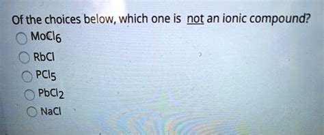 Pbbr2 this problem has been solved! Web of the choices below, which one is not an ionic compound? What is the correct chemical formula of the compound silicon tetrahydride? A) pbcl2 b) mocl6 c) rbcl d) pcl5 e) nacl d) pcl5 all atoms of a given. You'll get a detailed solution from a. Of the choices below, which one is not an ionic compound and why? Ionic compounds are always made up of a cation (positive ion) and an anion (negative ion). The cation is always listed first in the formula. Web although it polymerizes tetrahydrofuran, mocl5 is stable in diethyl ether. Web predict which of the following compounds are ionic and which are covalent, based on the location of their constituent atoms in the periodic table: