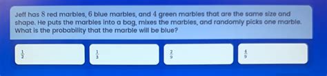 What is the probability that the marble volition be blue? Web jeff has 8 red marbles, 6 blue marbles, and 4 green marbles that are the same size andshape. Web jeff had 8 red marbles 6 blue marbles and 4 green marbles that are the same size and shape he puts the marbles into a bag mixed the marbles and randomly picks one marble what is the probability that the marble will be blue 2/94/91/31/2. Web jeff has 8 red marbles, 6 blue marbles , and 4 green marbles 1 see answer advertisement velezsayuri what is the question advertisement new questions in mathematics find the quotient 324÷0.6 express y in terms of x. Web jeff has 8 red marbles, 6 blue marbles, and 4 green marbles that are the same size and shape. 1 see answer advertisement adria071007 1/3 ! What is the probability that the marble will be blue 2 see answers advertisement avanik hey buddy i am here to help! Jeff has 8 red marbles, 6 blue marbles, and 4 green marbles that are the same size and shape. Jeff had 8 red marbles 6 blue marbles and 4 green marbles that are the same size and shape he. Red = 8 blue =. What is the probability that the marble will be blue?