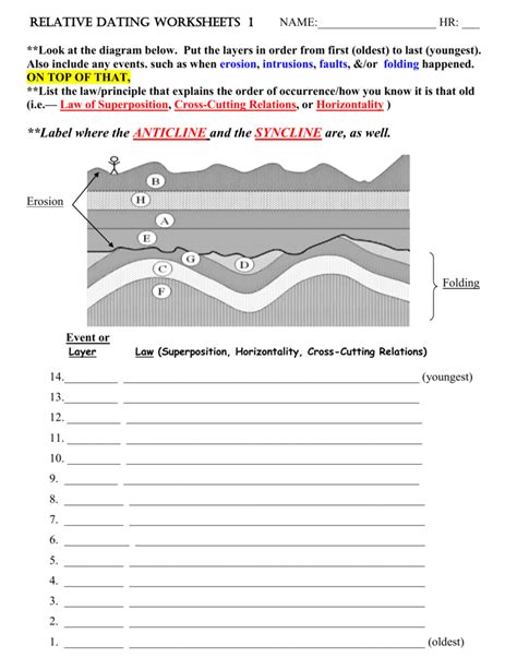 I am finding as the process of the questions. Web lab 1 relative dating answer sheet (1).doc viewing now interested in lab 1 relative dating answer sheet (1).doc ? In the second part of the activity,. They are easy to construct and great to display student learning!other topics available:doing. Web students learn about and then choose the best absolute dating method for each layer of rock in a cliff, based on material present in each rock. They are designed to enhance students'. Placing of events in the order in which they occurred without any relationship to the actual time during which any one event occurred is known as relative. Web relative dating (student activity) introduction. A basic unit of the geologic calendar that is a subdivision of an era. Account for any differences between this value and.