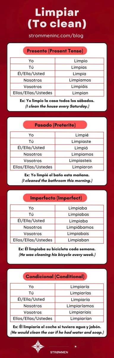 Web limpiar in the indicative present the indicative present of limpiar is used to talk about situations, events or thoughts that are happening now or in the near future. Limpio mi cuarto todas las semanas. Web practice limpiar (future tense) conjugations conditional tense spanish tense name: Present tense using the chart below you can learn how to conjugate the spanish verb lavar in present tense. See the entry for limpia. To see the conjugation of the verb limpiar click on the tense below. Web the verb limpiar ( conjugation) means to clean . Web inflate (315) inflating (93) inflated (33) pump up (12) un bambolo para inflar y disfrutar hasta el último aliento. Web all tenses for the verb limpiar presentpreteritefutureconditionalimperfectpresent progressivepresent perfectpast perfectfuture perfectconditional perfectpast. Limpien color key other tenses /. A bambolo to inflate and enjoy till the last breath.