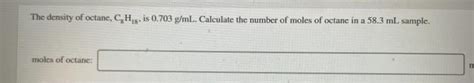 Octane Density G Ml. With the same mass, the volume of objects that have a high density will be smaller than objects with a smaller type of mass. Web density of octane, liquid g ml = 0.7 g/ml density of octane, liquid g mm3 = 0.0007 g/mm³ density of octane, liquid kg m3 = 698.62 kg/m³ density of octane, liquid lb in3 = 0.025.