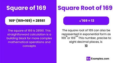 Squared Root Of 169. For example, the square of 4 is 16, 4 2 = 16, and the square root of 16, √16 = 4. Also, we know that the square of 13 is 169, i.e.