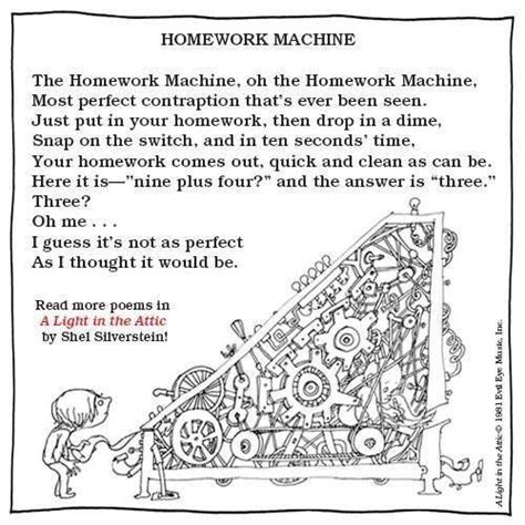 Web freakin' at the freakers ball, shel silverstein resource information the item freakin' at the freakers ball, shel silverstein represents a specific, individual, material embodiment of a. Web homework machine — shel silverstein | last.fm. Web the homework machine, by shel silverstein | poeticous: Web the homework machine, by shel silverstein | poeticous: Web the resource freakin' at the freaker's ball, shel silverstein, (sound recording) Web wynk music brings to you homework machine album version mp3 song from the movie/album the best of shel silverstein his words his songs his friends. Listen to homework machine from shel silverstein's a light in the attic for free, and see the artwork, lyrics and similar. Just put in your homework, then. The band name originates in reference to the famous children's author shel. Web after listening to the poem homework machine written by shel silverstein and published in a light in the attic, (harper collings publishers, 1981), students construct a function.